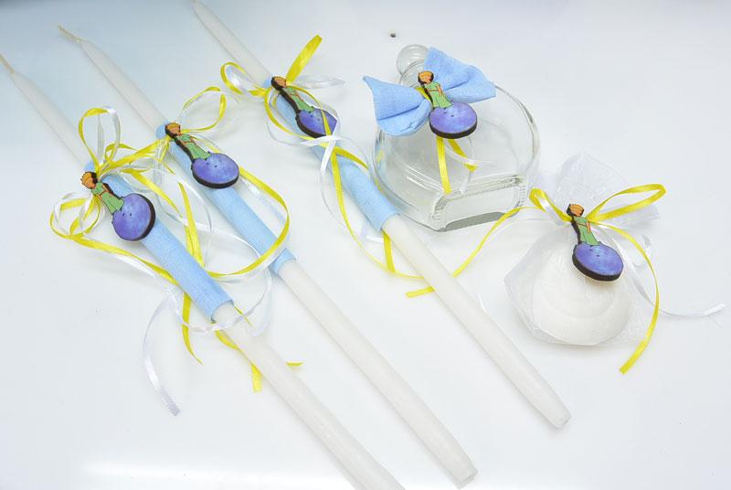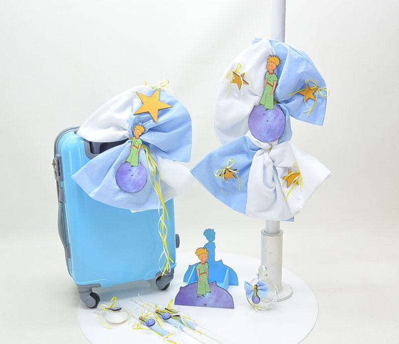 Σετ Βάπτισης Μικρός Πρίγκιπας. Το σετ περιλαμβάνει βαλίτσα στολισμένη, λαμπάδα βάπτισης, σετ λαδικού και σετ λαδόπανα .