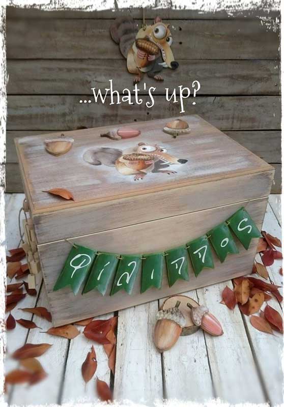 Ξύλινο Κουτί βάπτισης χειροποίητο με θέμα σκιουράκι. Διαστάσεις κουτιού 48 εκ μήκος x 34,5 εκ πλάτος x 28 εκ ύψος.