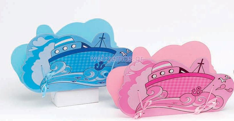 Καλάθι για μπομπονιέρες βάπτισης με σχέδιο καραβάκι σε 2 αποχρώσεις. Διαστάσεις 52 x 27 x 37 cm.