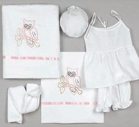 Λαδόπανα Βάπτισης με θέμα κουκουβάγια ελληνικής κατασκευής άριστης ποιότητας βαμβακερά. Το σετ περιλαμβάνει πετσέτα μικρή και μεγάλη, σεντονάκι και σετ εσώρουχα.