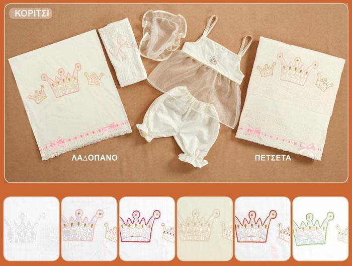 Λαδόπανα με σχέδιο κορώνα για κοριτσάκι ελληνικής κατασκευής άριστης ποιότητας σε διάφορες αποχρώσεις. Το σετ περιλαμβάνει πετσέτα μικρή και μεγάλη, σεντονάκι και σετ εσώρουχα.