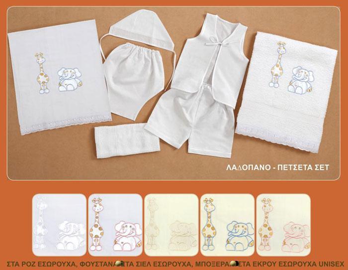 Λαδόπανα με θέμα ζωάκια ελληνικής κατασκευής άριστης ποιότητας σε διάφορες αποχρώσεις. Το σετ περιλαμβάνει πετσέτα μικρή και μεγάλη, σεντονάκι και σετ εσώρουχα.