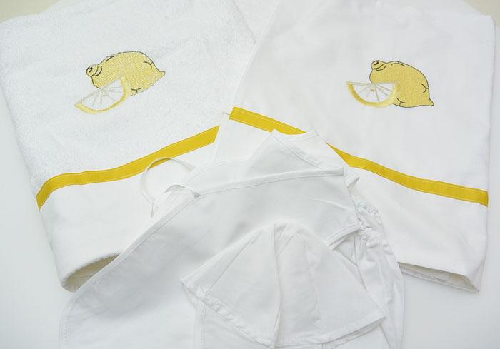 Λαδόπανα Βάπτισης με θέμα λεμόνι ελληνικής κατασκευής άριστης ποιότητας βαμβακερά. Το σετ περιλαμβάνει πετσέτα μικρή και μεγάλη, σεντονάκι και σετ εσώρουχα.