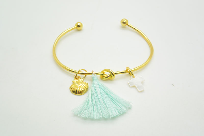 Μαρτυρικό Βραχιόλι κοχύλι σε χρυσή απόχρωση με σταυρό φίλντισι και φούντα σε χρώμα της επιλογής σας. Το αστέρι μπορεί να γίνει σε διάφορες αποχρώσεις.