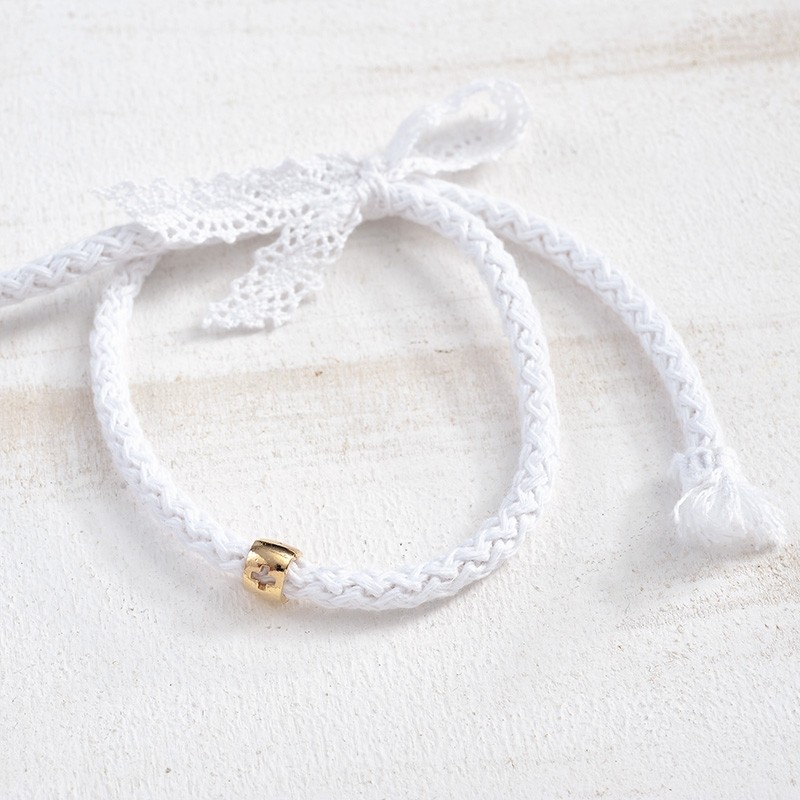 Μαρτυρικό βραχιόλι με κορδόνι πλεκτό λευκό και επίχρυσο σταυρουδάκι, δεμένο με σατέν λευκό κορδελάκι και δαντελίτσα λευκή.