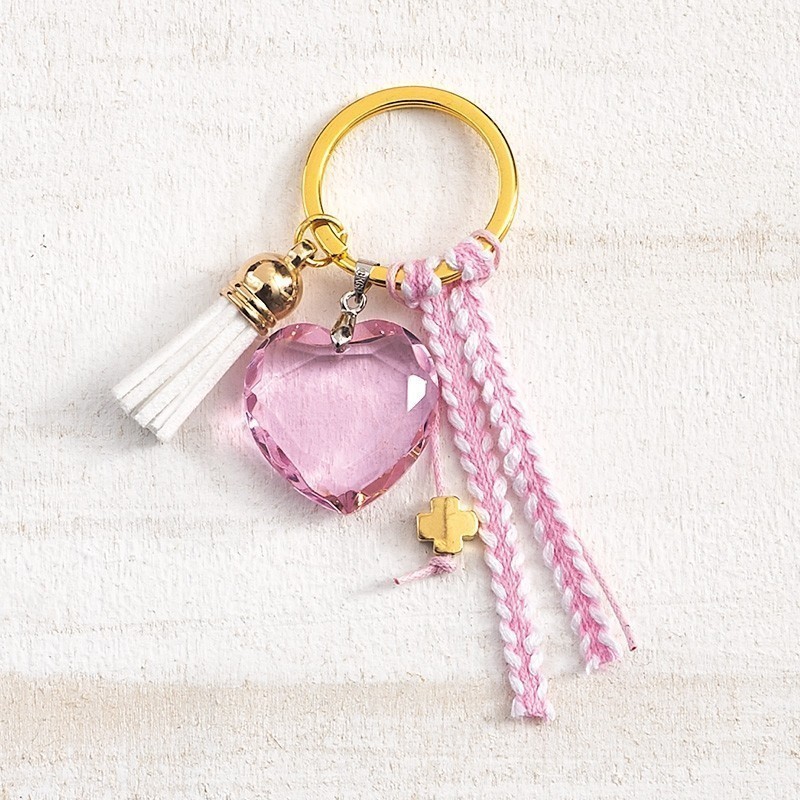 Μαρτυρικό μπρελόκ χρυσό με καρδιά ροζ,φουντίτσα από δερματίνη λευκή, κορδόνι βαμβακερό δίχρωμο λευκό-ροζ και επίχρυσο σταυρουδάκι .
