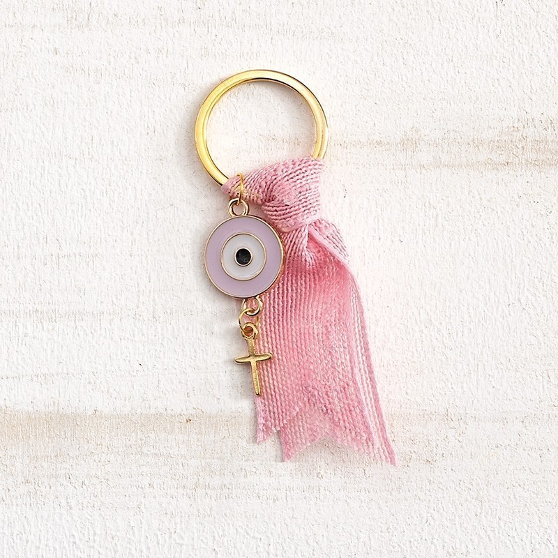 Μαρτυρικό μπρελόκ χρυσό με κορδέλα γάζας ροζ,μάτι στρογγυλό ροζ και επίχρυσο σταυρουδάκι.