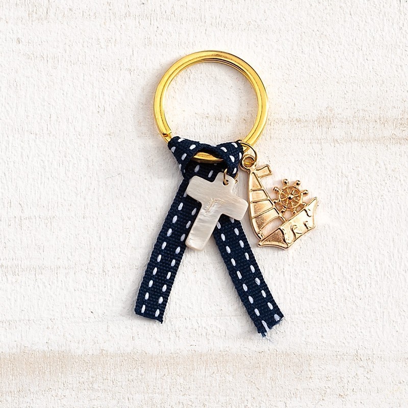 Μαρτυρικό μπρελόκ χρυσό με κορδέλα υφασμάτινη μπλε με γαζί λευκό,φίλντισι σταυρουδάκι λευκό και μοτίφ καραβάκι ροζ χρυσό.
