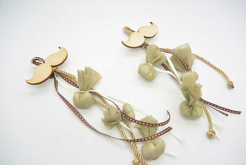 Μπομπονιέρα Βάπτισης μουστάκι μαγνητάκι κρεμαστή σε απόχρωση βεραμάν - φυσικό. Η τιμή αφορά δεμένη μπομπονιέρα με 5 κουφέτα αμυγδάλου. Διάσταση διακοσμητικού 7 x 2.5 cm.