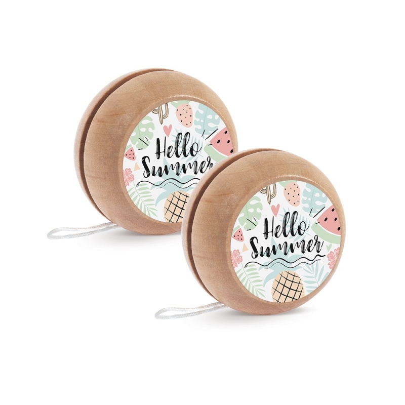 Ξύλινο natural γιο-γιο με σκοινάκι. Είναι διακοσμημένο με αυτοκόλλητο print Hello Summer με διαφορετικό σχέδιο μπρος-πίσω.