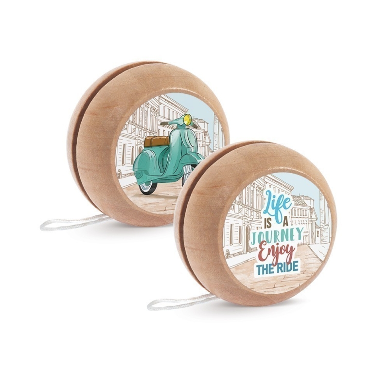 Ξύλινο natural γιο-γιο με σκοινάκι. Είναι διακοσμημένο με αυτοκόλλητο print Βέσπα με διαφορετικό σχέδιο μπρος-πίσω.