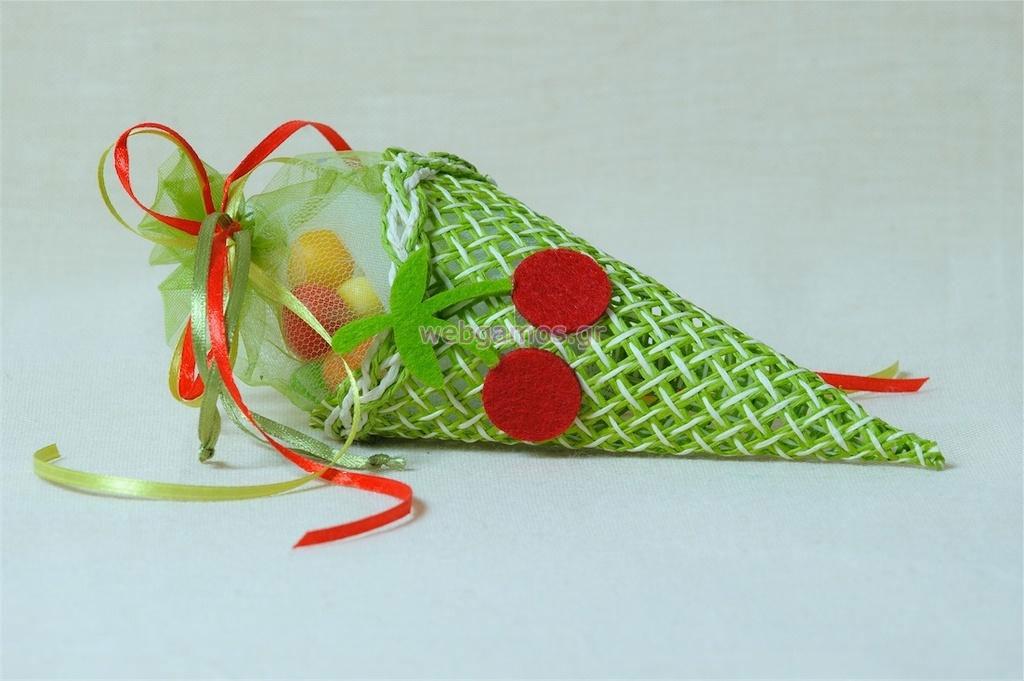 Μπομπονιέρα Βάπτισης κερασάκι σε ψάθινο χωνάκι. Διαστάσεις χωνάκι 21 x 8 cm.