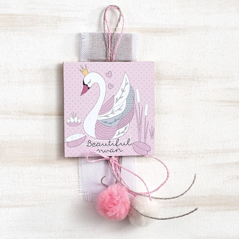 Ξύλινο διακοσμητικό καδράκι κύκνος κρεμαστό με λινάτσα και pom pom.