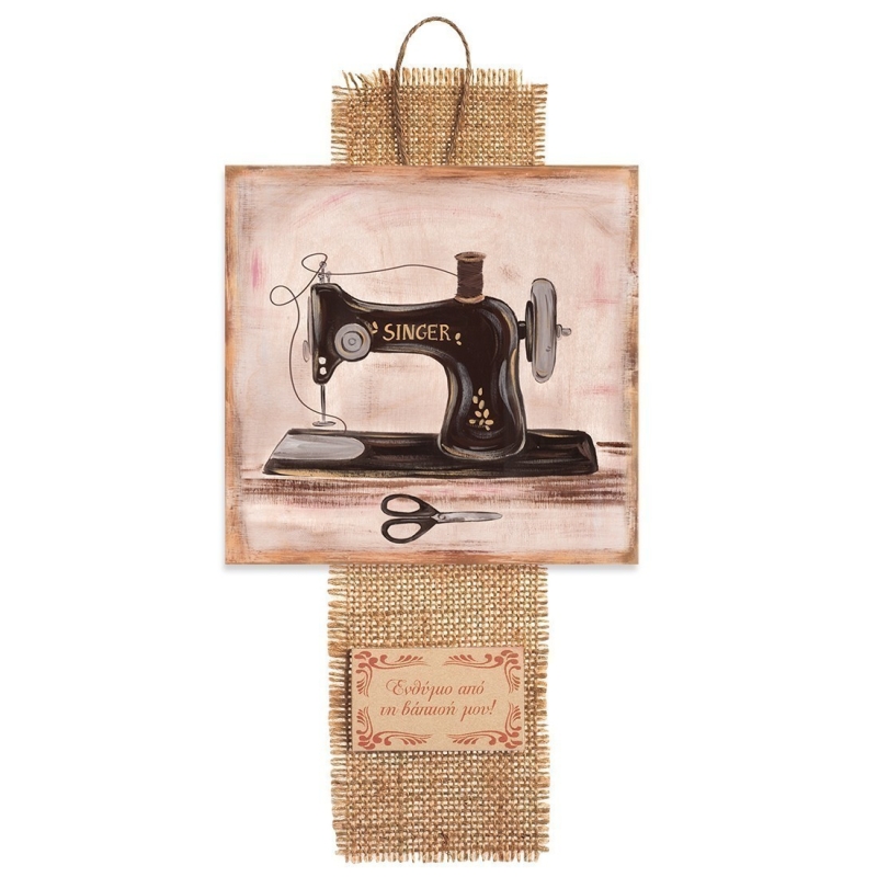 Ξύλινο διακοσμητικό καδράκι κρεμαστό με λινάτσα ,print με παράσταση ραπτομηχανή Singer και καρτελάκι με τη φράση "Ενθύμιο από τη βάπτισή μου!" σε απόχρωση καφέ.