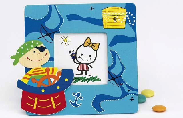 Μπομπονιέρα βάπτισης κορνίζα πειρατής. Στην τιμή περιλαμβάνονται το δέσιμο της μπομπονιέρας με 7 κουφετάκια smarties. Διαστάσεις 13 cm.