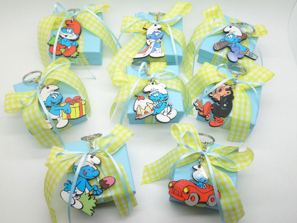 Κουτάκι με μπρελόκ στρουμφάκι ξύλινο. Μπορούμε να φτιάξουμε οποιαδήποτε φιγούρα στρουμφάκι θέλετε. Η τιμη περιλαμβάνει το δέσιμο της μπομπονιέρας με 5 κουφέτα αμυγδάλου.