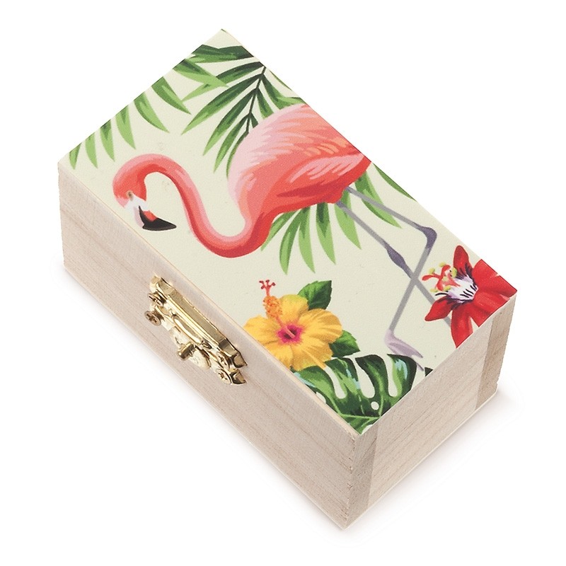 Ξύλινο natural σεντούκι με μεταλλικό κούμπωμα. Είναι διακοσμημένο με αυτοκόλλητο print flamingo.