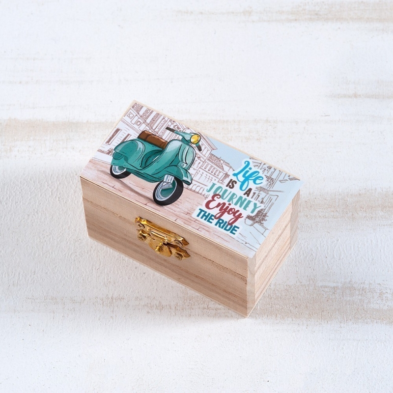 Ξύλινο natural σεντούκι με μεταλλικό κούμπωμα. Είναι διακοσμημένο με αυτοκόλλητο print Βέσπα.