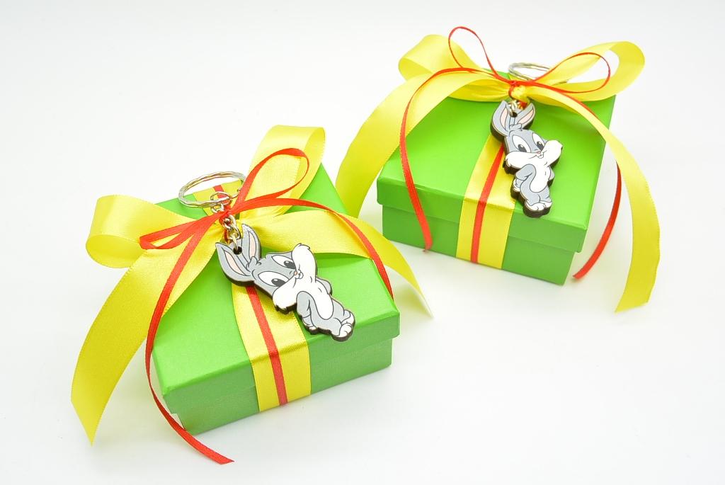 Μπομπονιέρα Βάπτισης κουτάκι με μπρελόκ ξύλινο bugs bunny. Η τιμή αφορά δεμένη μπομπονιέρα με 5 κουφέτα αμυγδάλου ή 9 κουφετάκια smarties.