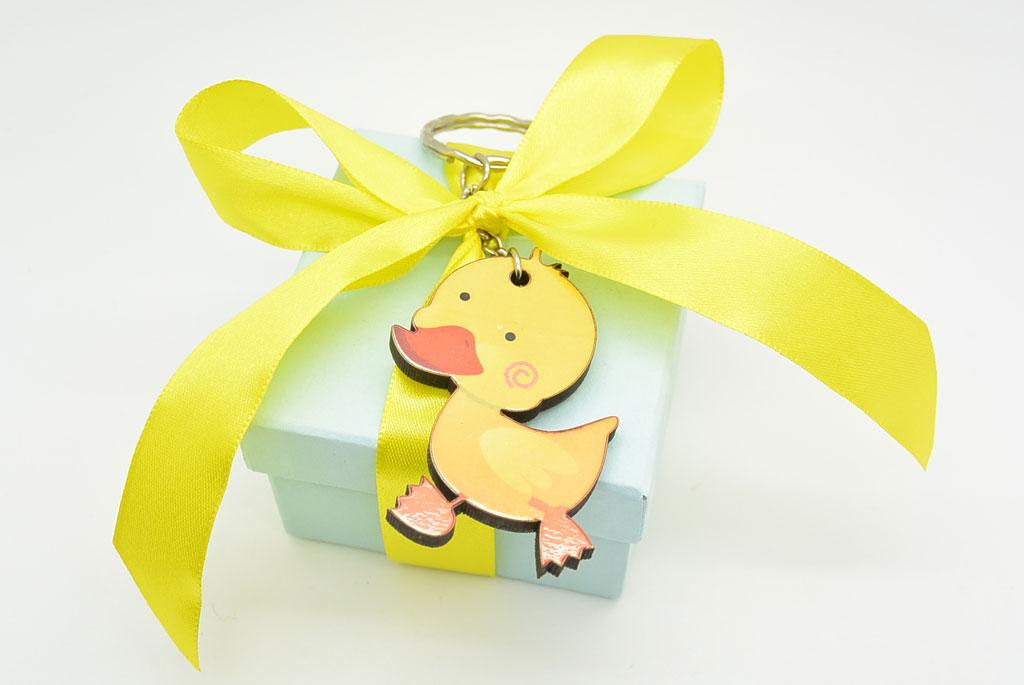 Μπομπονιέρα Βάπτισης κουτάκι με ξύλινο μπρελόκ παπάκι. Η τιμή αφορά δεμένη μπομπονιέρα με 5 κουφέτα αμυγδάλου ή 9 κουφετάκια smarties. Διάσταση μπρελόκ 12 εκ. Μπορεί να γίνει σε δίαφορες αποχρώσεις.