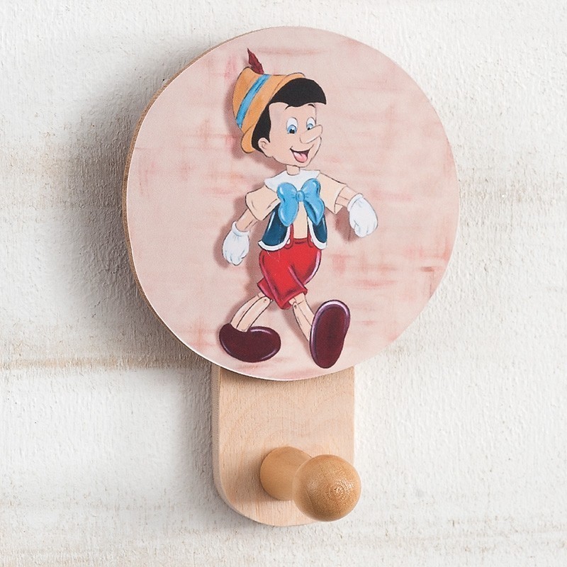 Ξύλινη natural κρεμάστρα τοίχου, διακοσμημένη με στρογγυλό κοπτικό πάνω στο οποίο είναι τυπωμένη παράσταση με τον Πινόκιο.