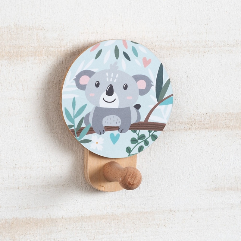 Ξύλινη natural κρεμάστρα τοίχου, διακοσμημένη με στρογγυλό κοπτικό Koala.
