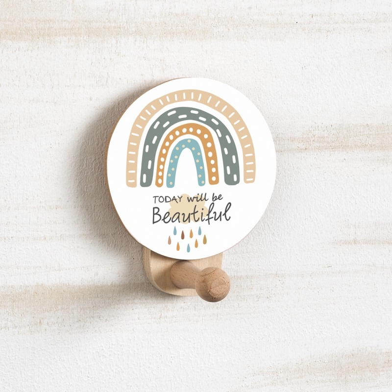 Ξύλινη στρογγυλή κρεμάστρα τοίχου με print αυτοκόλλητο ουράνιο τόξο γήινες αποχρώσεις.