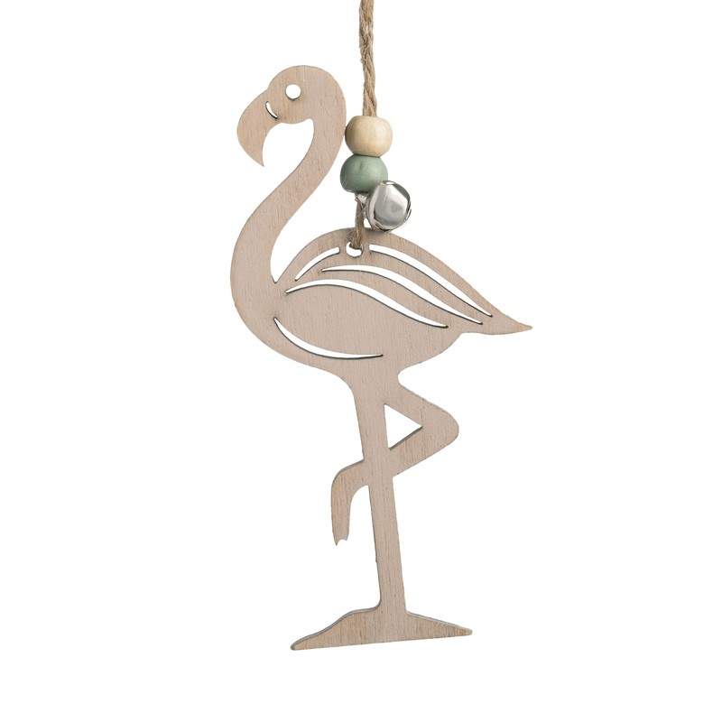 Ξύλινο κρεμαστό flamingo σε natural απόχρωση. Στο πάνω μέρος είναι διακοσμημένο με βεραμάν χάντρες, κουδουνάκι και σπάγγο.
