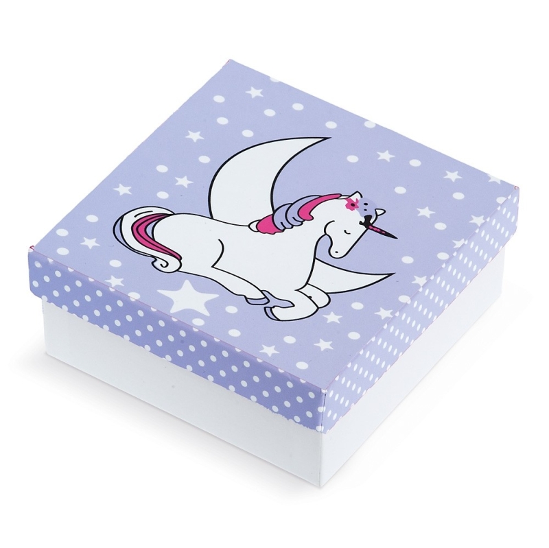 Χάρτινο κουτί με αποσπώμενο χάρτινο καπάκι σε χρώμα λιλά με λευκά πουά και αστέρια. Print με παράσταση μονόκερος σε λευκό χρώμα με λεπτομέρειες ροζ και λιλά.