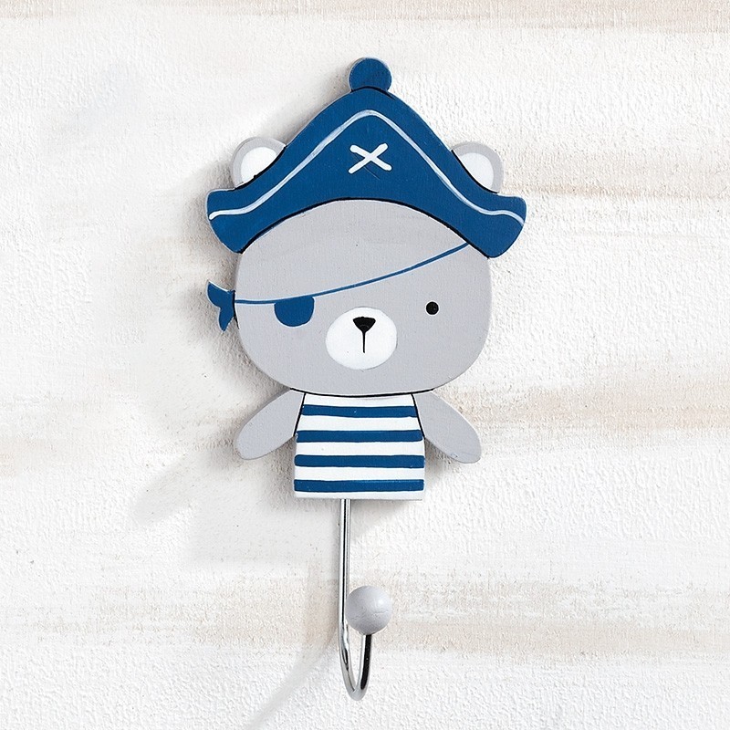 Ξύλινη κρεμάστρα τοίχου με ναυτικό αρκουδάκι-πειρατή σε αποχρώσεις γκρι-μπλε