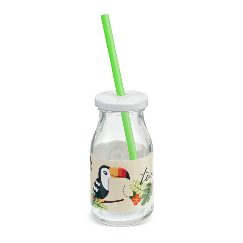 Γυάλινο μπουκάλι γάλακτος 200ml με λευκό μεταλλικό καπάκι. Συνοδεύεται από πολύχρωμα καλαμάκια. Είναι διακοσμημένο με αυτοκόλλητο print toucan.
