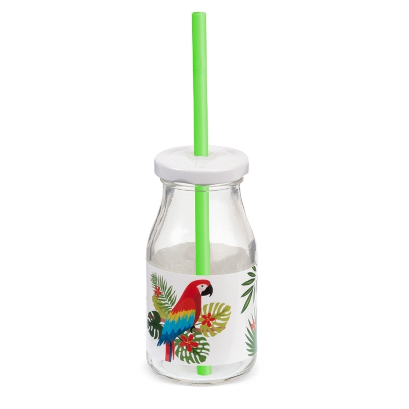 Γυάλινο μπουκάλι γάλακτος 200ml με λευκό μεταλλικό καπάκι. Συνοδεύεται από πολύχρωμα καλαμάκια. Είναι διακοσμημένο με αυτοκόλλητο print παπαγάλος.