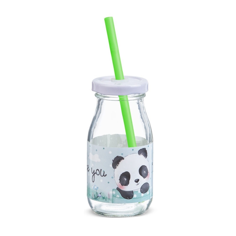 Γυάλινο μπουκάλι γάλακτος 200ml με λευκό μεταλλικό καπάκι. Συνοδεύεται από πολύχρωμα καλαμάκια. Είναι διακοσμημένο με αυτοκόλλητο print Panda.