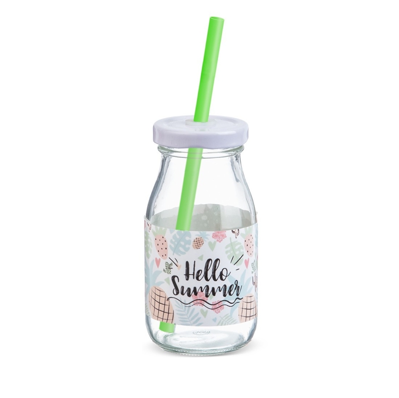 Γυάλινο μπουκάλι γάλακτος 200ml με λευκό μεταλλικό καπάκι. Συνοδεύεται από πολύχρωμα καλαμάκια. Είναι διακοσμημένο με αυτοκόλλητο print Hello Summer.