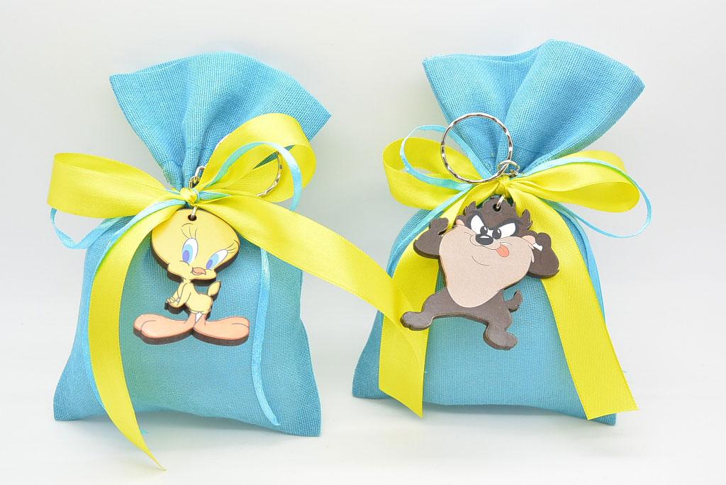 Μπομπονιέρα Βάπτισης σε πουγκάκι με μπρελόκ ξύλινο με τον ταζ. Το μπρελόκ μπορεί να γίνει οποιαδήποτε φιγούρα του θέματος. Η τιμή περιλαμβάνει 5 κουφέτα αμυγδάλου ή 9 κουφετάκια smarties.