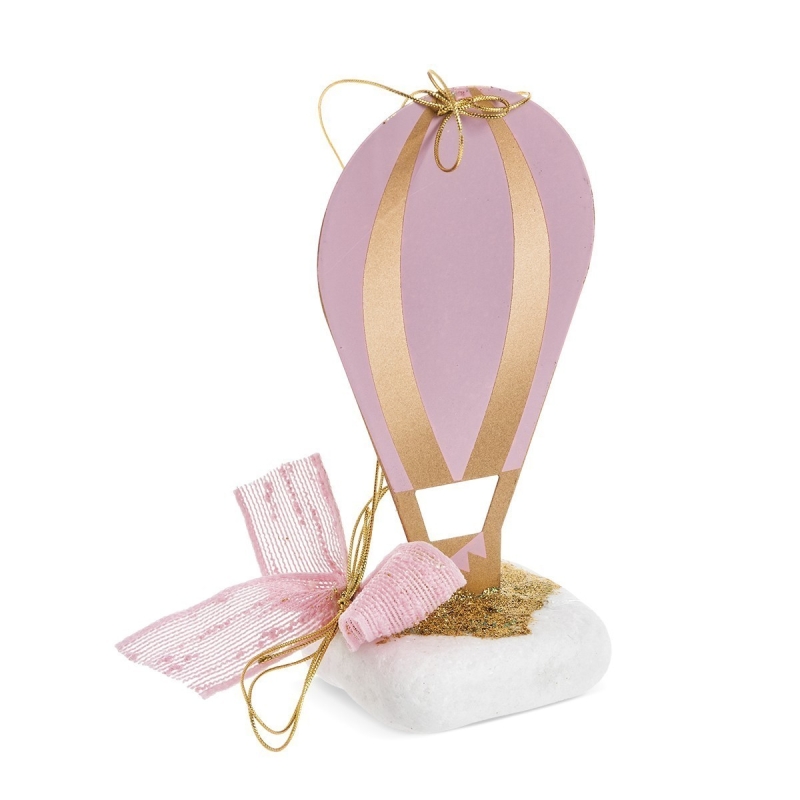 Χειροποίητο διακοσμητικό βότσαλο σε λευκό χρώμα και σβησίματα χρυσά. Είναι στολισμένο με μεταλλικό αερόστατο σε ροζ και χρυσές αποχρώσεις και λινή κορδέλα.