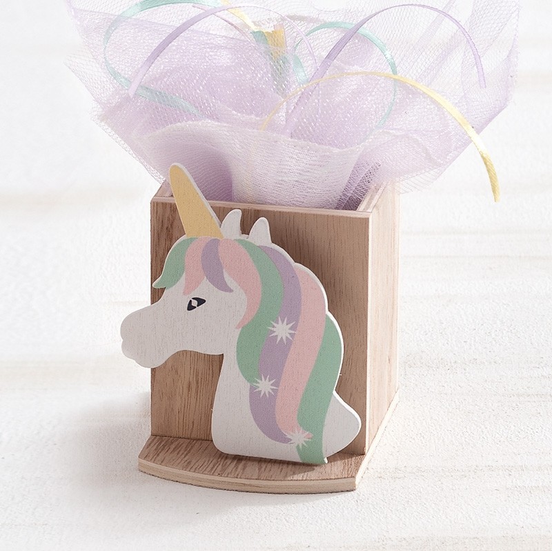 Ξύλινη natural μολυβοθήκη με μανταλάκι για σημειώσεις και κάρτες, με σχέδιο μονόκερο σε απόχρωση λευκή με πολύχρωμη χαίτη