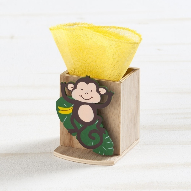 Ξύλινη μολυβοθήκη σε natural χρώμα. Είναι διακοσμημένη με ξύλινη παράσταση μαϊμού σε καφέ χρώμα και πράσινο φύλλο.