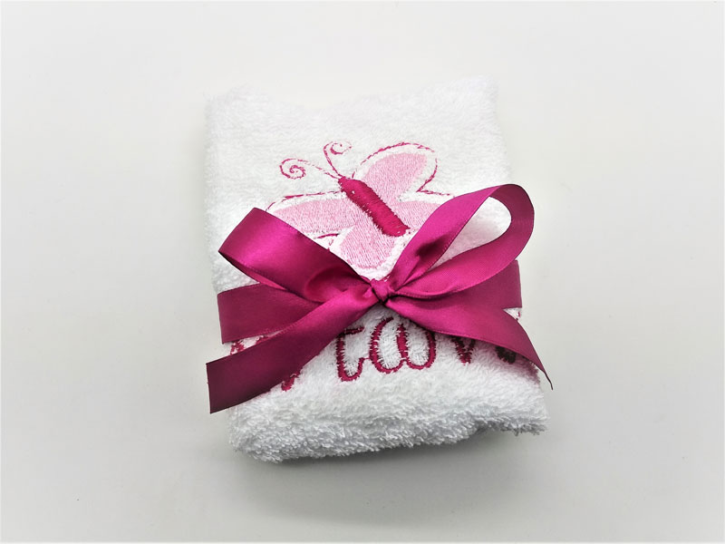 Μπομπονιέρα Βάπτισης πετσέτα με κεντημένο θέμα πεταλούδα. Η τιμή αφορά δεμένη μπομπονιέρα με 5 κουφέτα αμυγδάλου ή 9 κουφετάκια smarties. Διάσταση πετσέτας 30 χ 50 εκ. Με έξτρα χρέωση 0.30 μπορεί να κεντηθεί και το όνομα του παιδιού