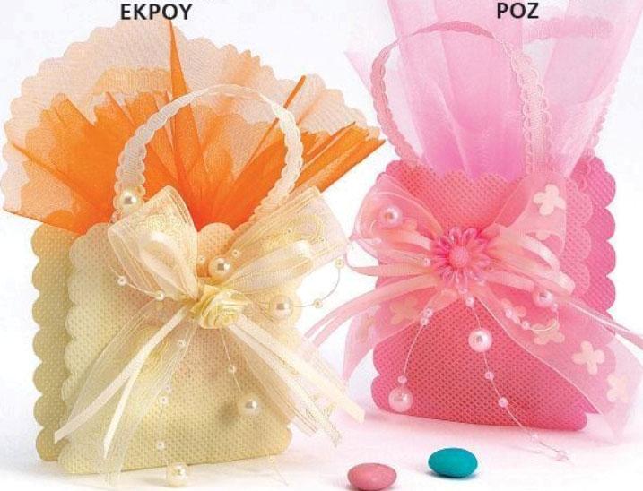 Πουγκί Τσαντάκι σε 2 αποχρώσεις με διαστάσεις 14 εκ. Η τιμή αφορά δεμένη μπομπονιέρα με 5 κουφέτα αμυγδάλου ή 9 κουφετάκια smarties.