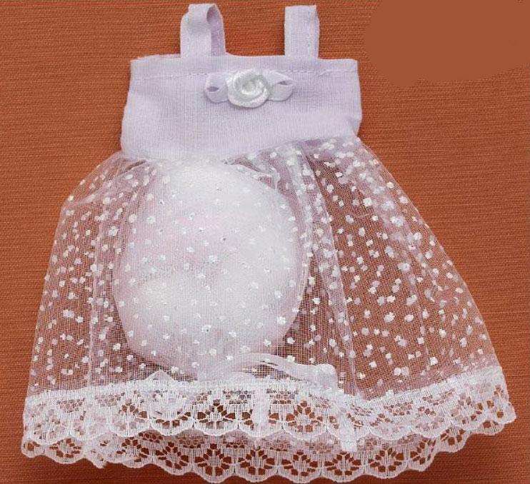 Πουγκί Φορεματάκι σε λευκή απόχρωση με διαστάσεις 11 εκ. Η τιμή αφορά δεμένη μπομπονιέρα με 5 κουφέτα αμυγδάλου ή 9 κουφετάκια smarties.