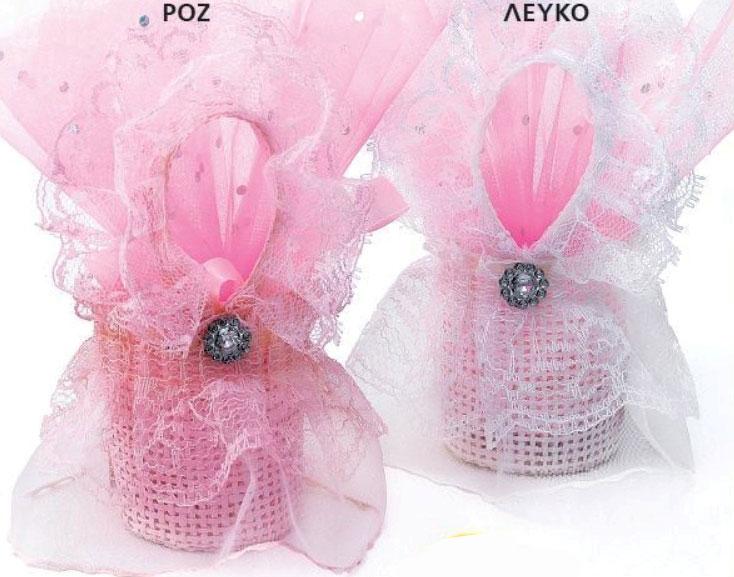 Πουγκί Καλαθάκι σε 2 αποχρώσεις με διαστάσεις 13 εκ. Η τιμή αφορά δεμένη μπομπονιέρα με 5 κουφέτα αμυγδάλου ή 9 κουφετάκια smarties.