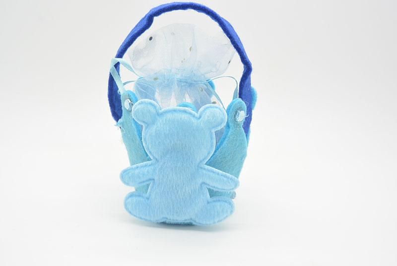 Μπομπονιέρα βάπτισης αρκουδάκι σε πουγκί καλαθάκι. Στην τιμή περιλαμβάνονται το δέσιμο της μπομπονιέρας με 9 κουφετάκια smarties ή 5 αμυγδάλου. Διαστάσεις 10 x 7 εκ. Μπορεί να γίνει και σε ροζ απόχρωση.