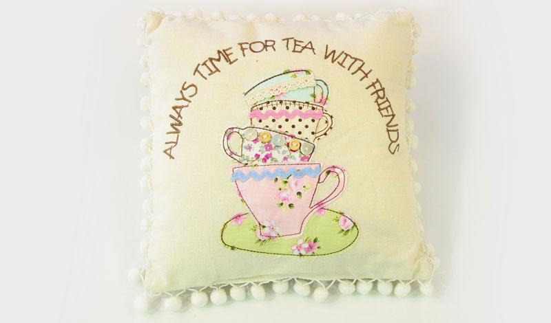 Μαξιλαράκι Κεντημένο με φλυτζανάκια και πον πον με διάσταση 25X25 εκ.