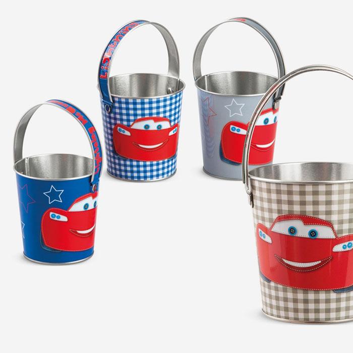 Μπομπονιέρα Βάπτισης cars μεταλλικό κουβαδάκι με διαστάσεις ύψος 9,8εκ και διάμετρο 10 εκ