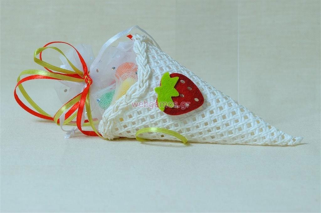 Μπομπονιέρα Βάπτισης φράουλα σε ψάθινο χωνάκι. Διαστάσεις χωνάκι 21 x 8 cm.