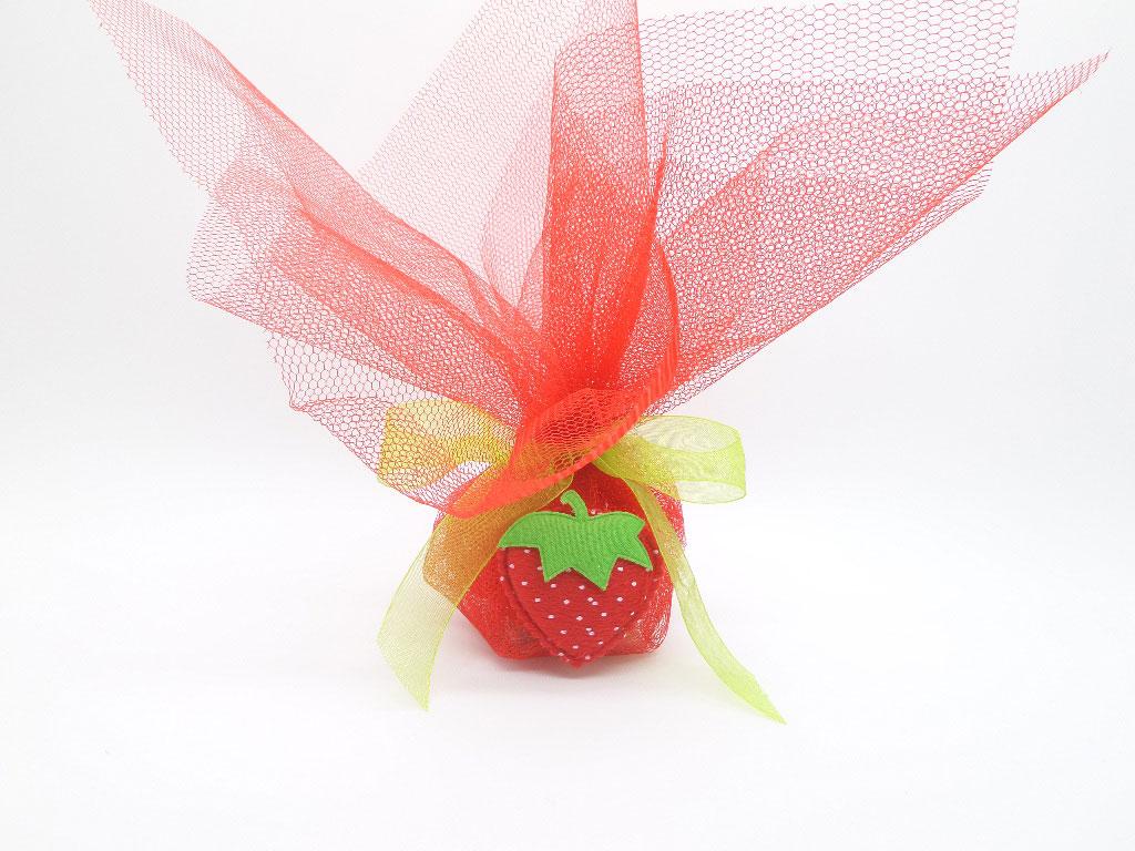 Μπομπονιέρα Βάπτισης φράουλα με τούλι σε διαστάσεις 44 x 44 εκ. Στην τιμή περιλαμβάνεται το δέσιμο της μπμπονιέρας με 5 κουφέτα αμυγδάλου.
