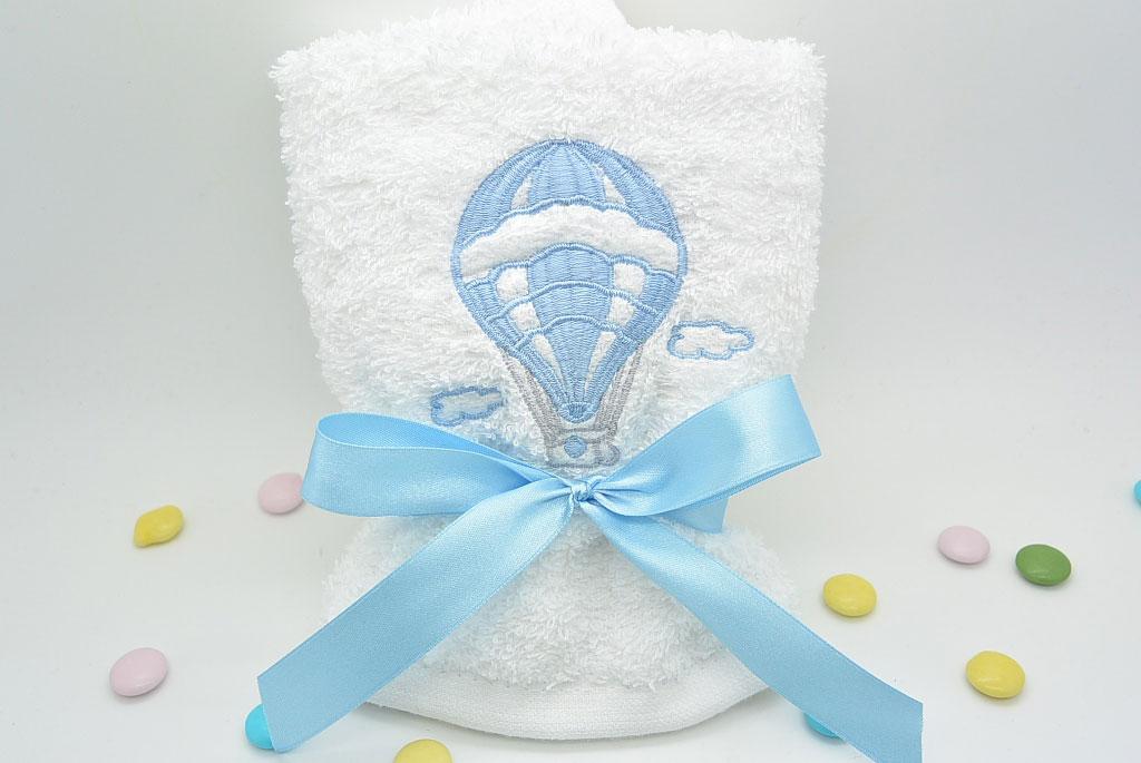 Μπομπονιέρα Βάπτισης πετσέτα με κεντημένο θέμα αερόστατο. Η τιμή αφορά δεμένη μπομπονιέρα με 5 κουφέτα αμυγδάλου ή 9 κουφετάκια smarties. Διάσταση πετσέτας 30 χ 50 εκ. Με έξτρα χρέωση 0.30 μπορεί να κεντηθεί και το όνομα του παιδιού.