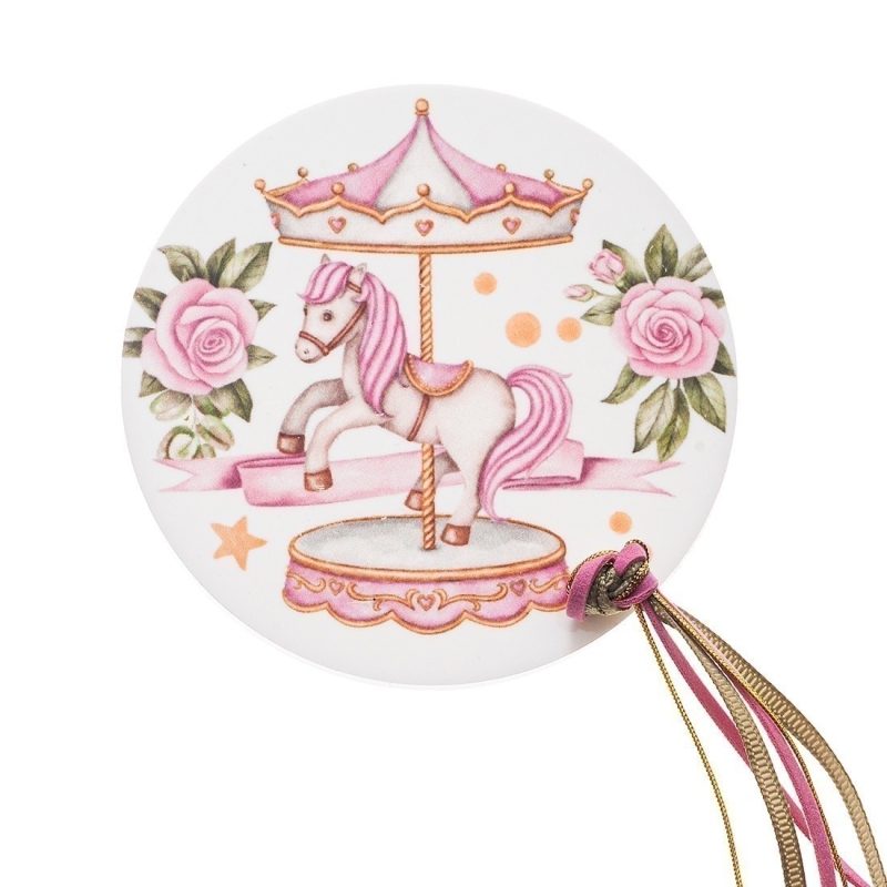 Σουβέρ σε στρογγυλό σχήμα με print plexiglass παράσταση σε λευκό χρώμα. Η παράσταση απεικονίζει ένα ροζ καρουζέλ.