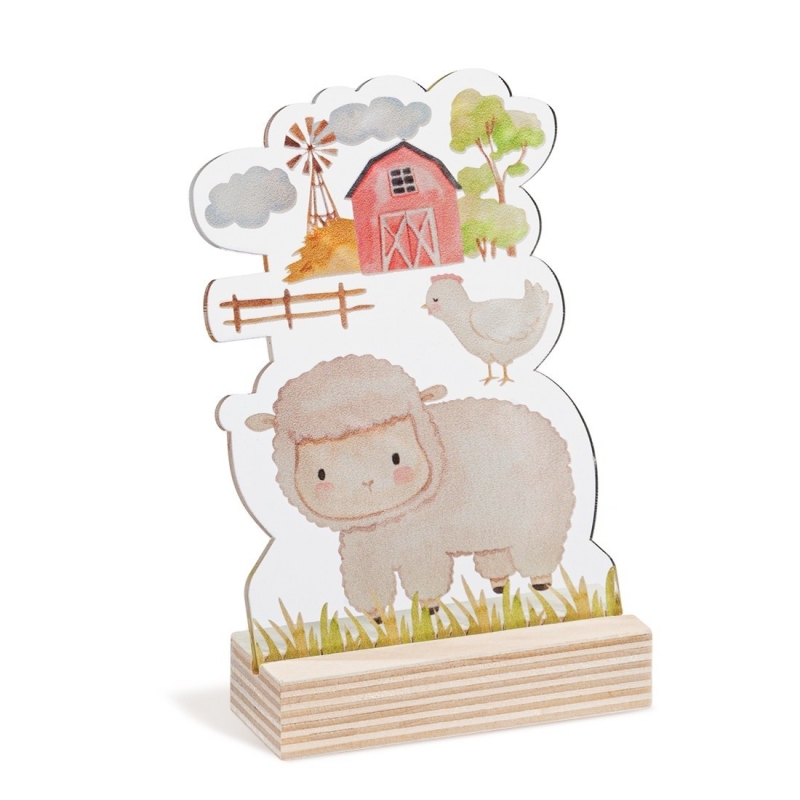 Ξύλινη βάση με print plexiglass κοπτικό. Η παράσταση απεικονίζει σε διάφανο χρώμα ένα προβατάκι και μια κοτούλα στην φάρμα.